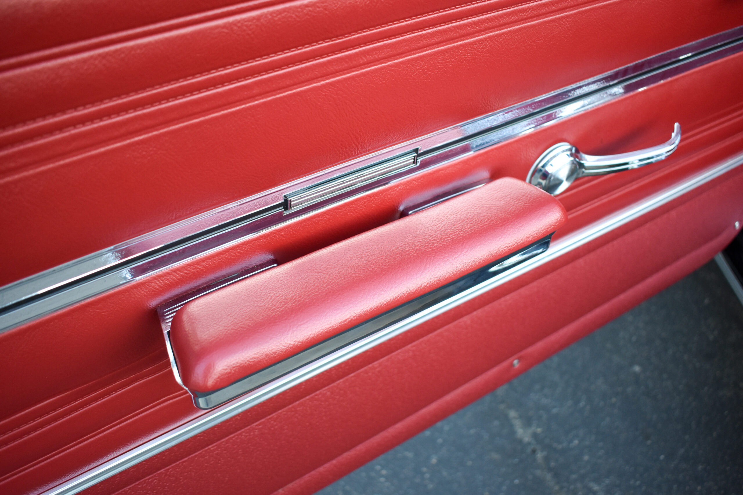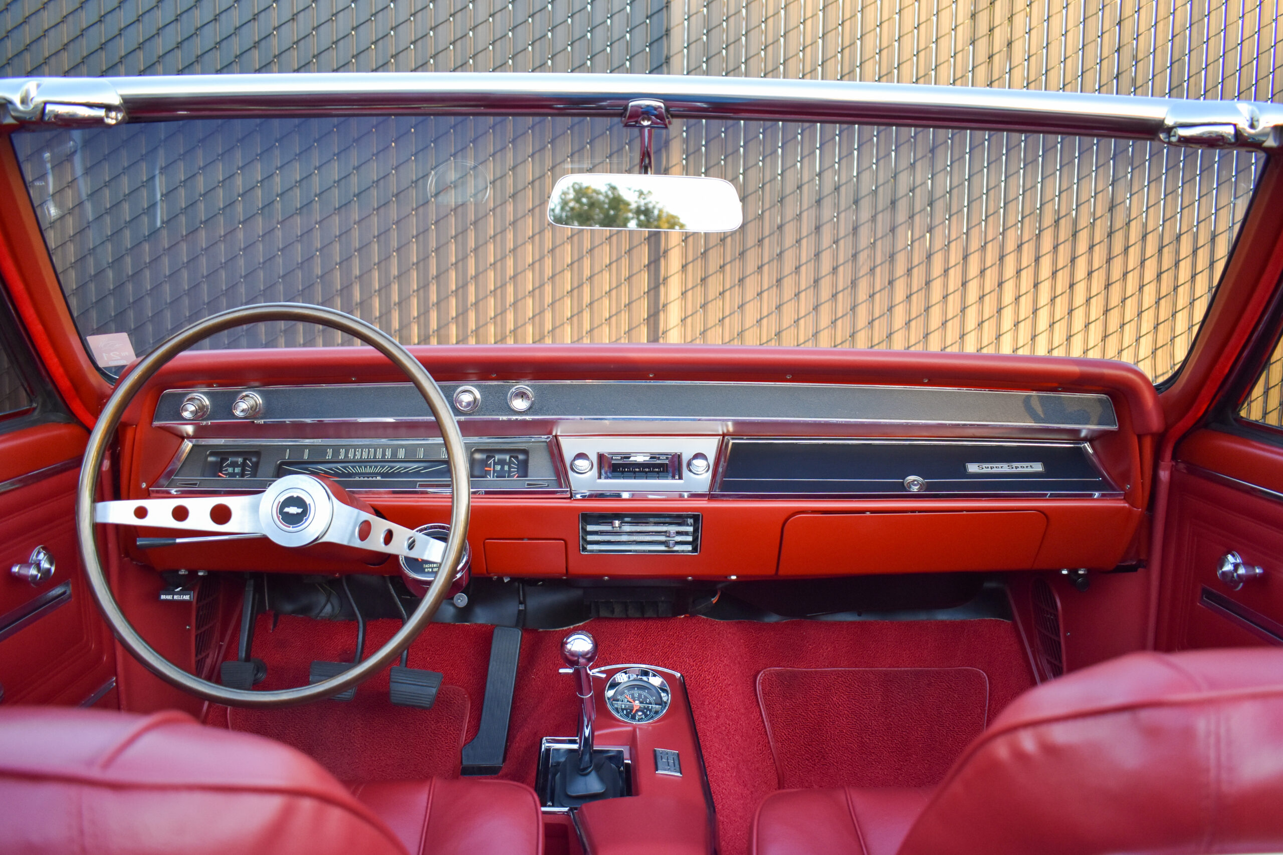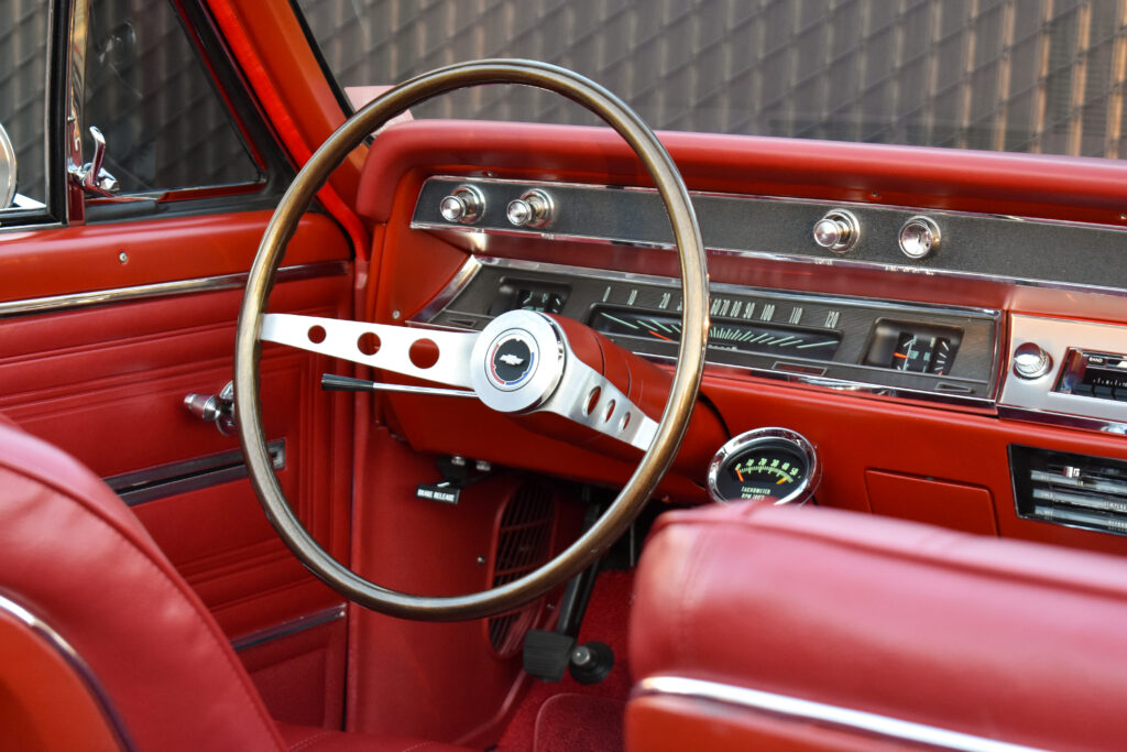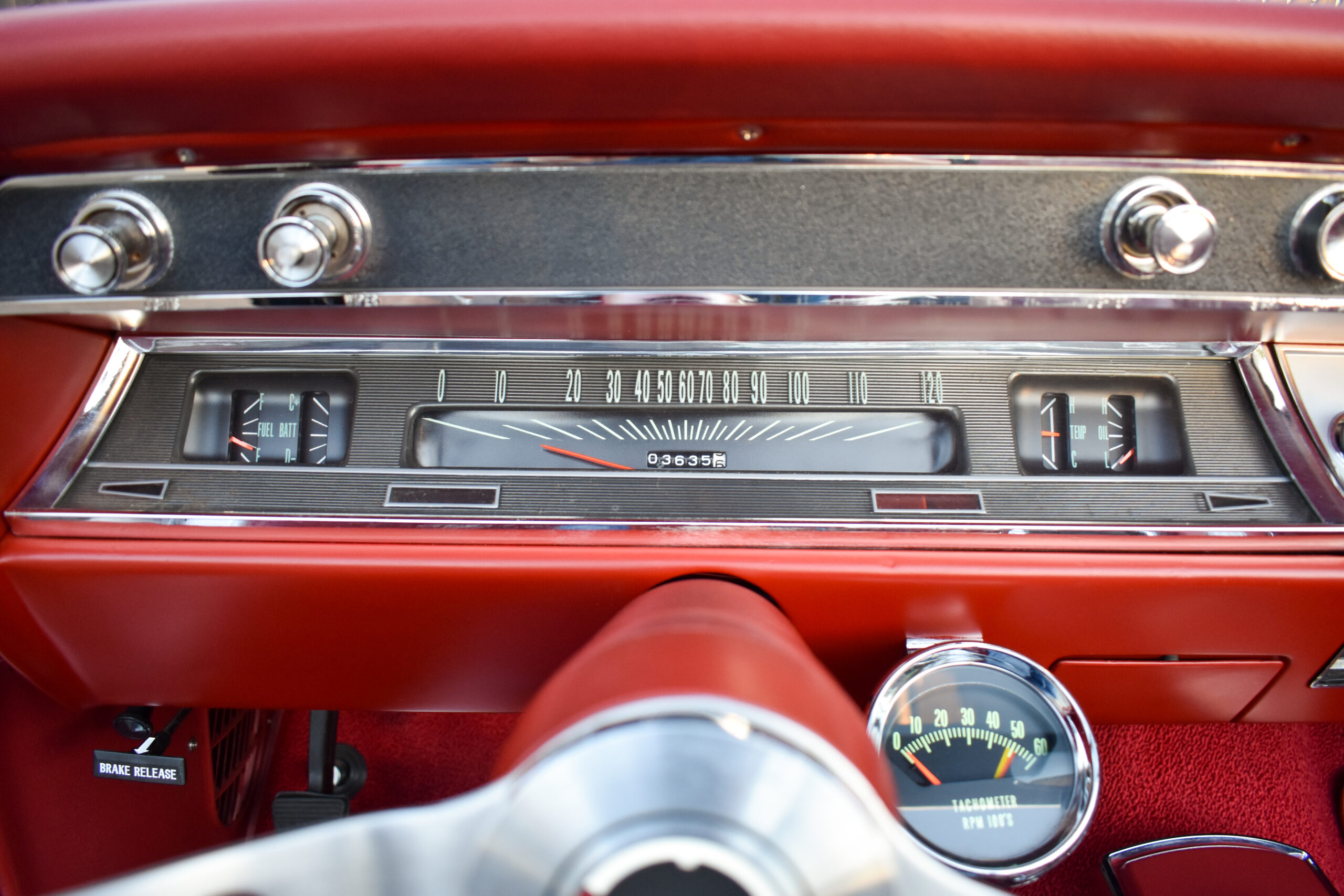 The 2-Spoke GM Steering wheel is in impeccable condition and compliments the 1966 GM dash. The restoration displays a lot of attention to detail with how new everything looks. The Knee-Knocker Tachometer displays its 5K Red-Line and you can see the Factory clock in the center console below.