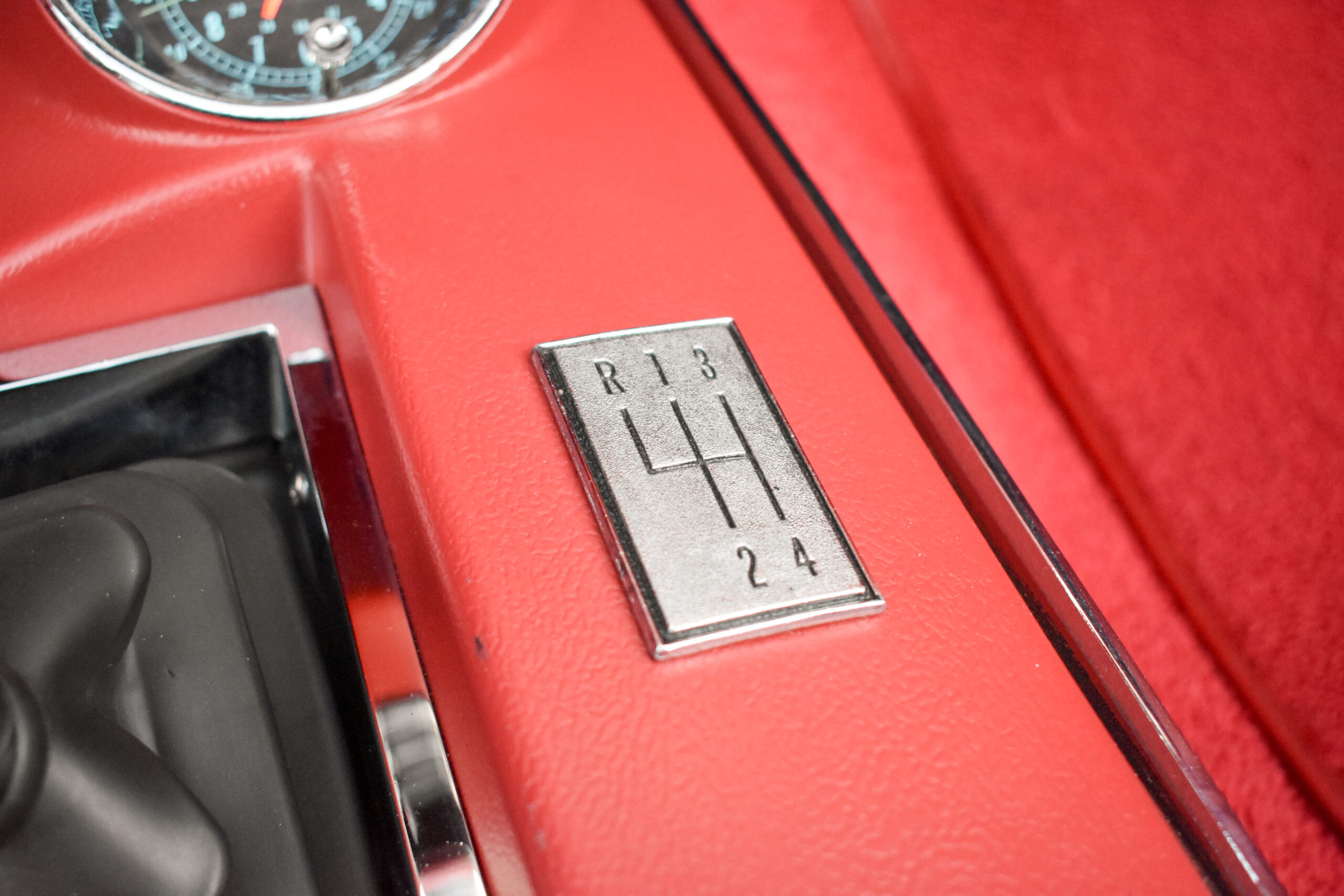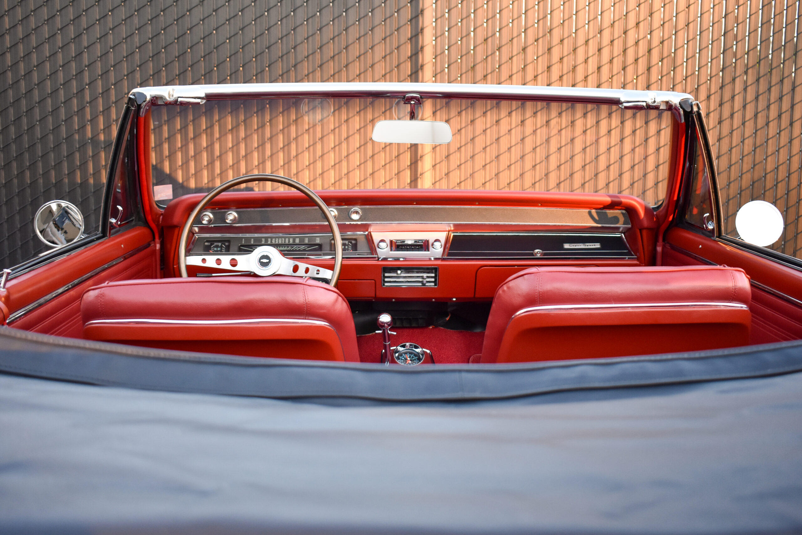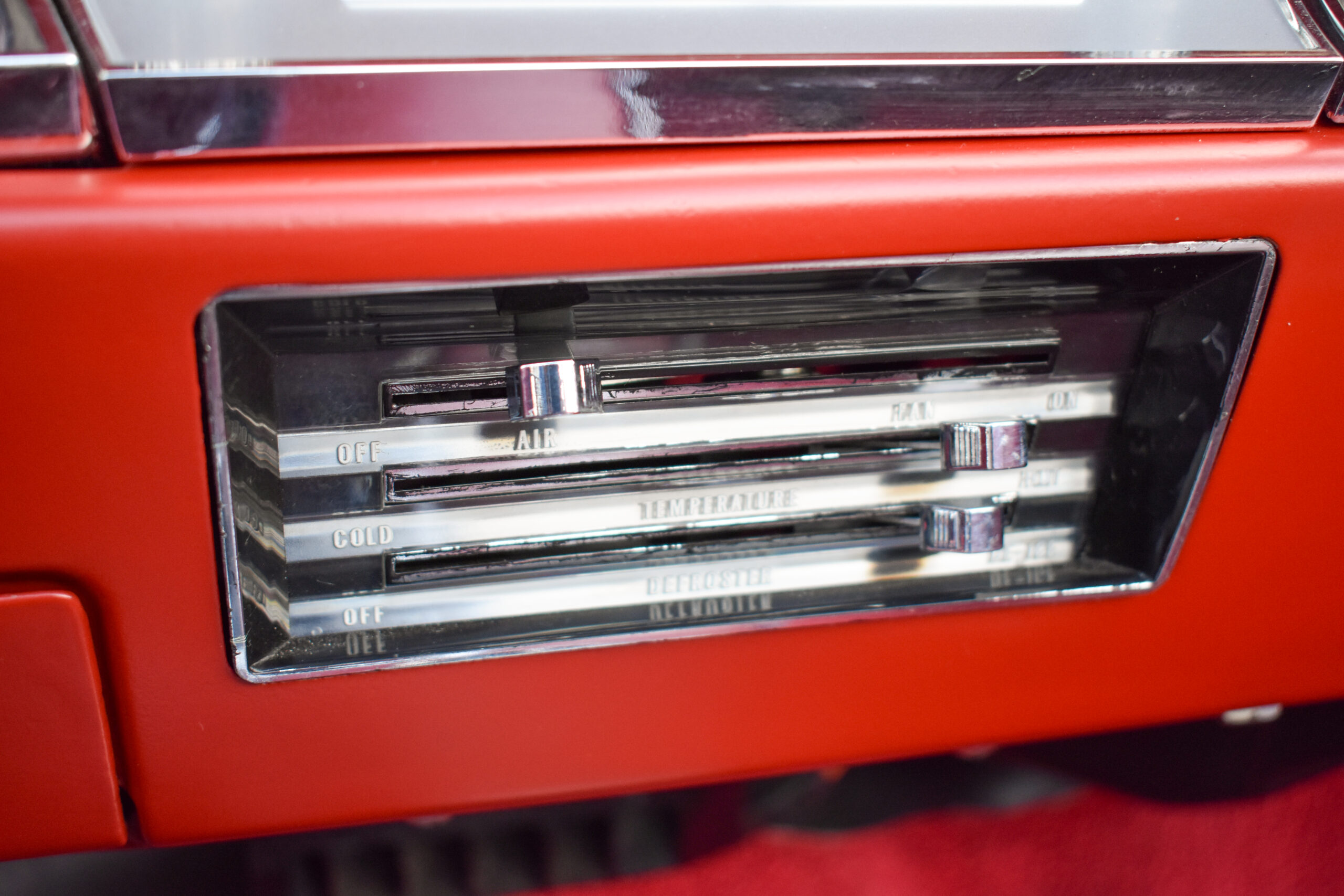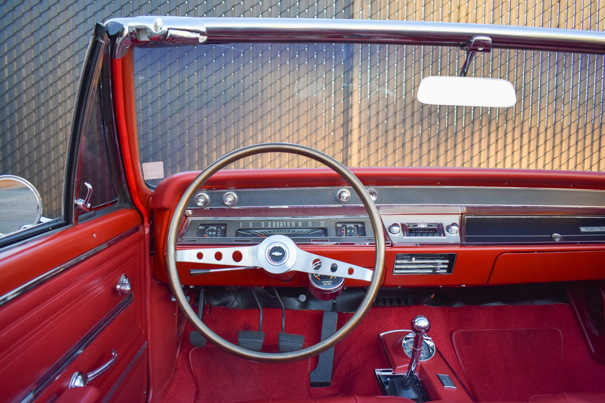 The 2-Spoke GM Steering wheel is in impeccable condition and compliments the 1966 GM dash. The restoration displays a lot of attention to detail with how new everything looks. The Knee-Knocker Tachometer displays its 5K Red-Line and you can see the Factory clock in the center console below.