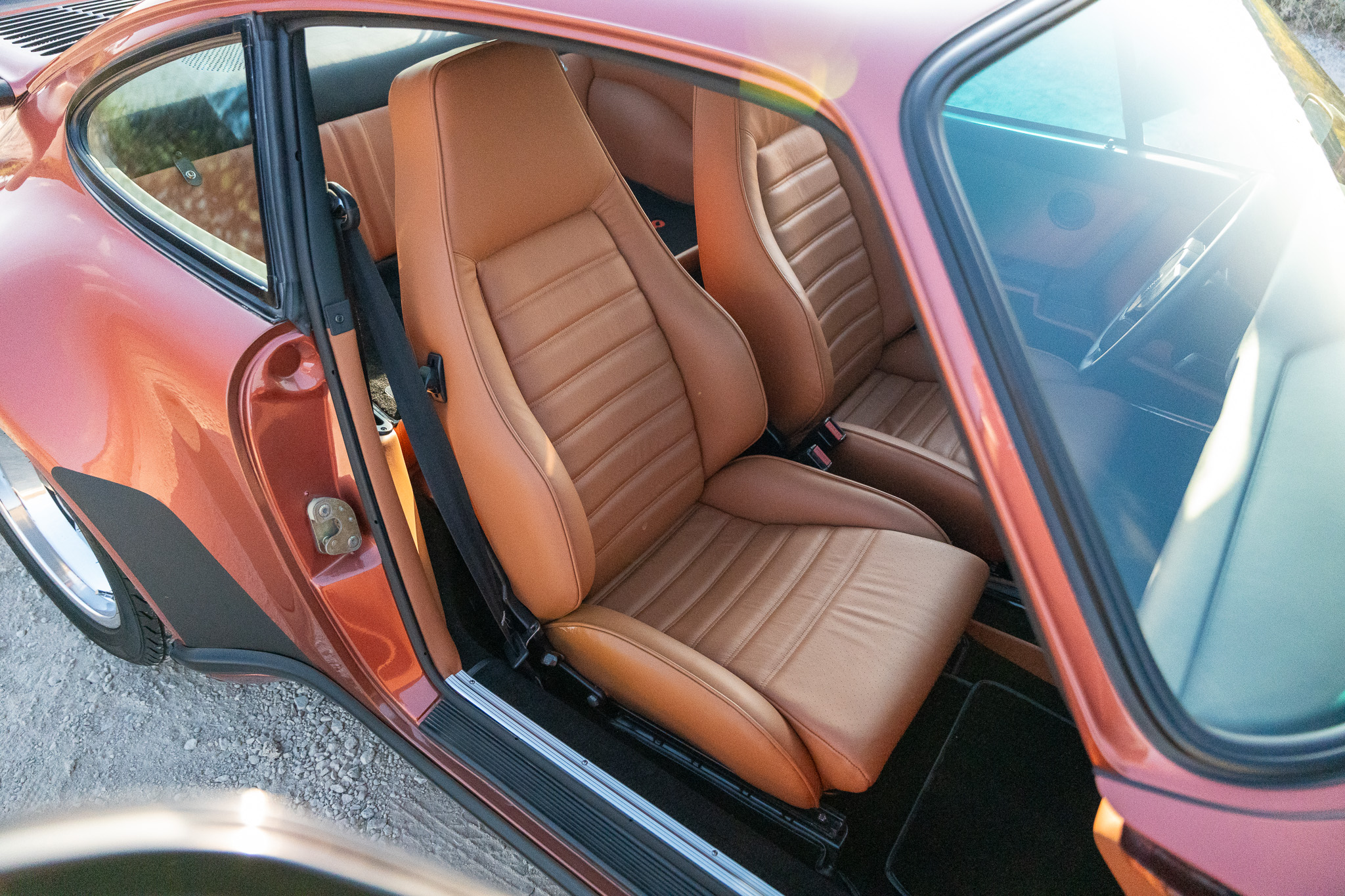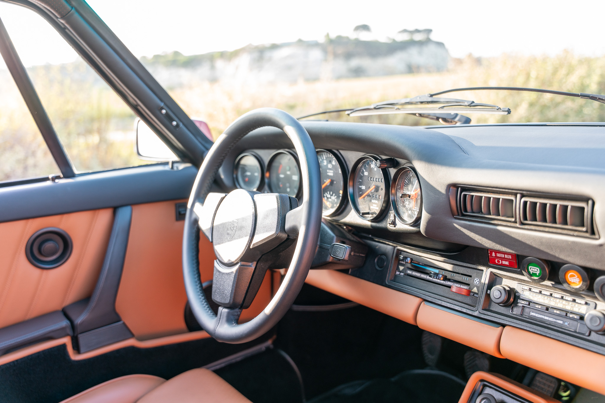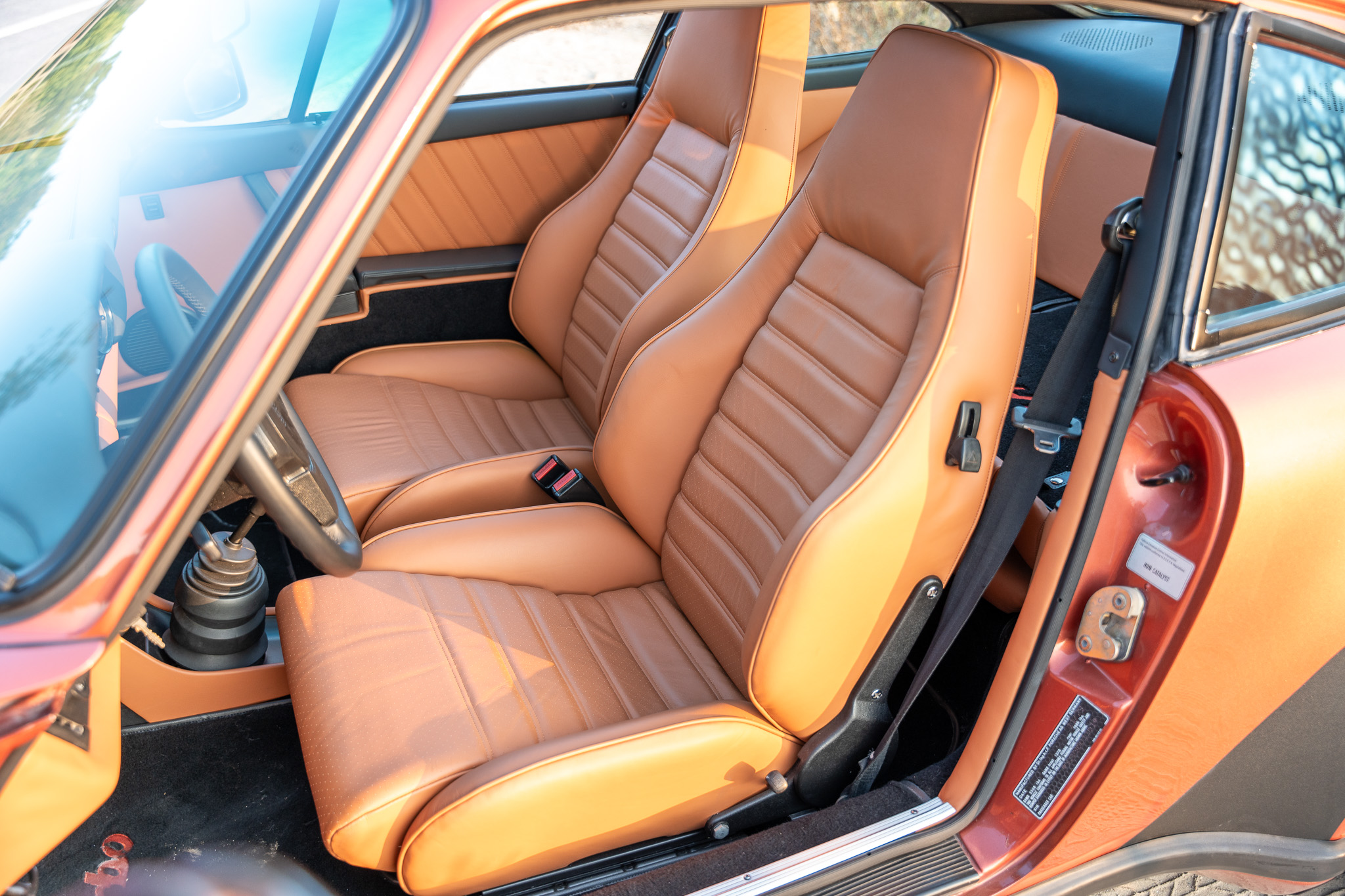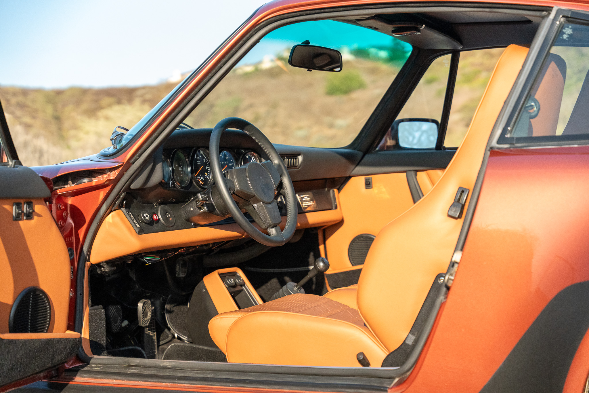 The Cork Leather interior is complimented with Black Leather on the Dash and Tops of Door Cards. A View of the Cockpit with the Leather-wrapped 3-Spoke steering wheel, Gauge Cluster, Factory Porsche Radio, Power accessories such as Windows and Sun Roof, Heater and Air Conditioning controls, and of course the Signature Series Plaque. With the U.S. emissions restrictions tightening once again in 1980, 1979 became the last model year that the Porsche 930 was specified for the American market for some time to come. Recognizing this, the American distribution arm earmarked the last 50 cars delivered to U.S. owners, often commemorating them with special plaques and certificates. The so-called “Final 50,” largely those that occupied chassis nos. 1151 through 1200. This car being Chassis No. 1161