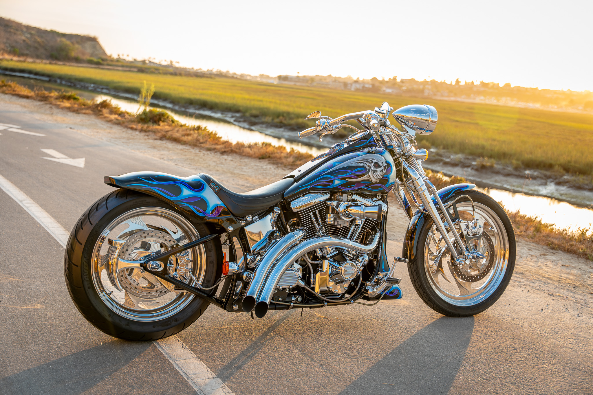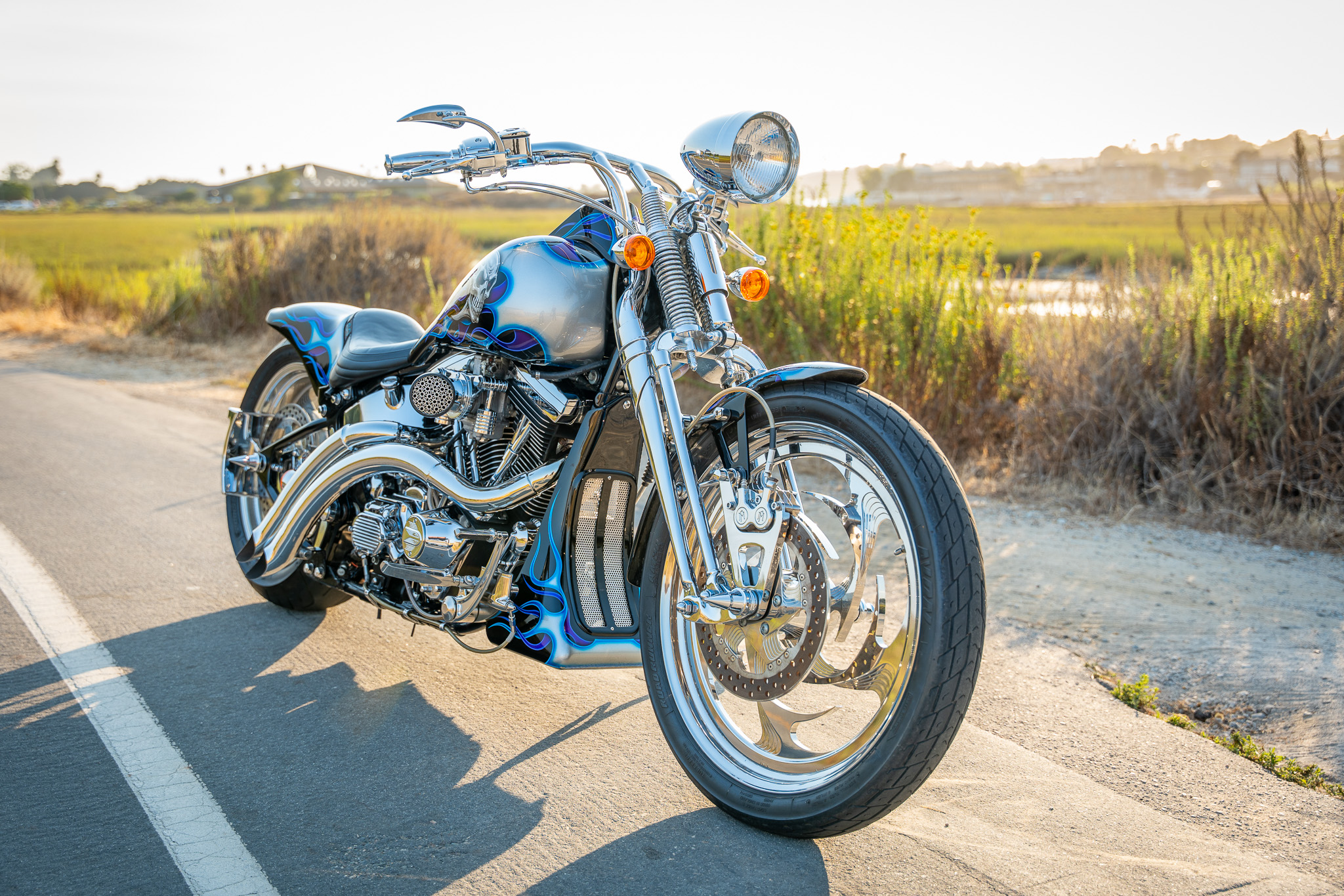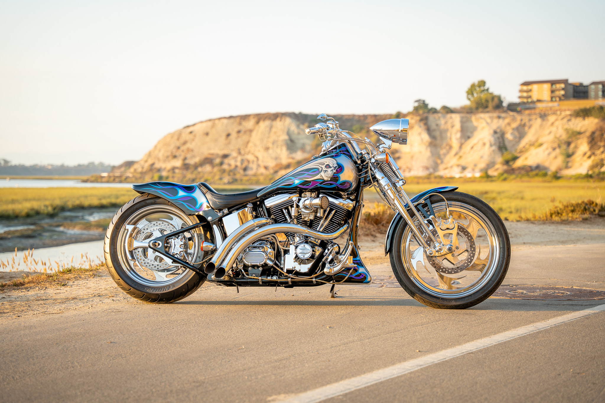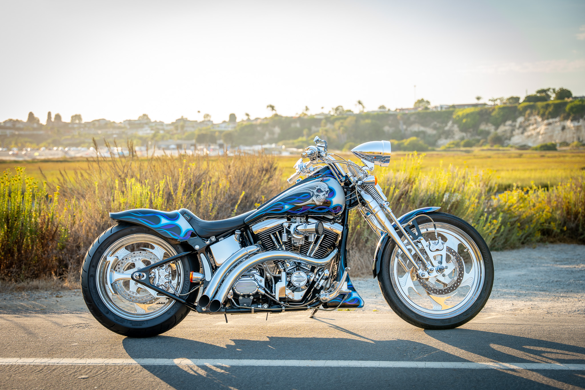 This Fully Custom 1999 Harley Davidson FXSTS Springer Softail currently resides in Newport Beach, CA. This Bike was built in the early 2000s with no expense spared. The Build cost more than $55,000 back in the day. It has been garage kept and meticulously cared for over the years preserving it in its showroom condition that it remains in today. With only 3,660 Original Miles, this bike has barely seen the Road. That’s less than 150 Miles per year. All of the items on this bike have been professionally installed by a Harley Davidson Dealer. The parts include PM Forward Controls, PM Front & Rear Brakes, Chrome Swing Arm, Paul Yale License Plate Holder, Arlen Ness HeadLight with Blue Light, Arlen Ness Mirrors, Jesse James Hell Bent Pipes, Corbin Seat, Stretched Fuel Tanks, Custom Rear Fender with Brake Light, EV 77 CM, Piston Kit, Adjustable Push Rods, Crane Single Fire Coil, Crane Single Fire Ignition, Speeding Bullet Turn Signals, upgraded Carburetor, and a few other accessories. The Custom Paint Scheme was completed by Pro-Paint of Baltimore, MD and still remains in superb condition.
