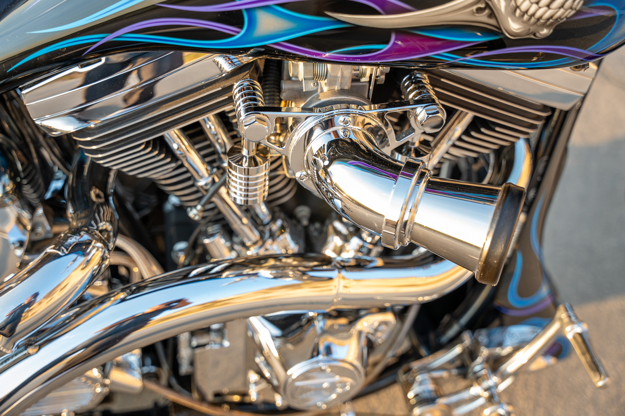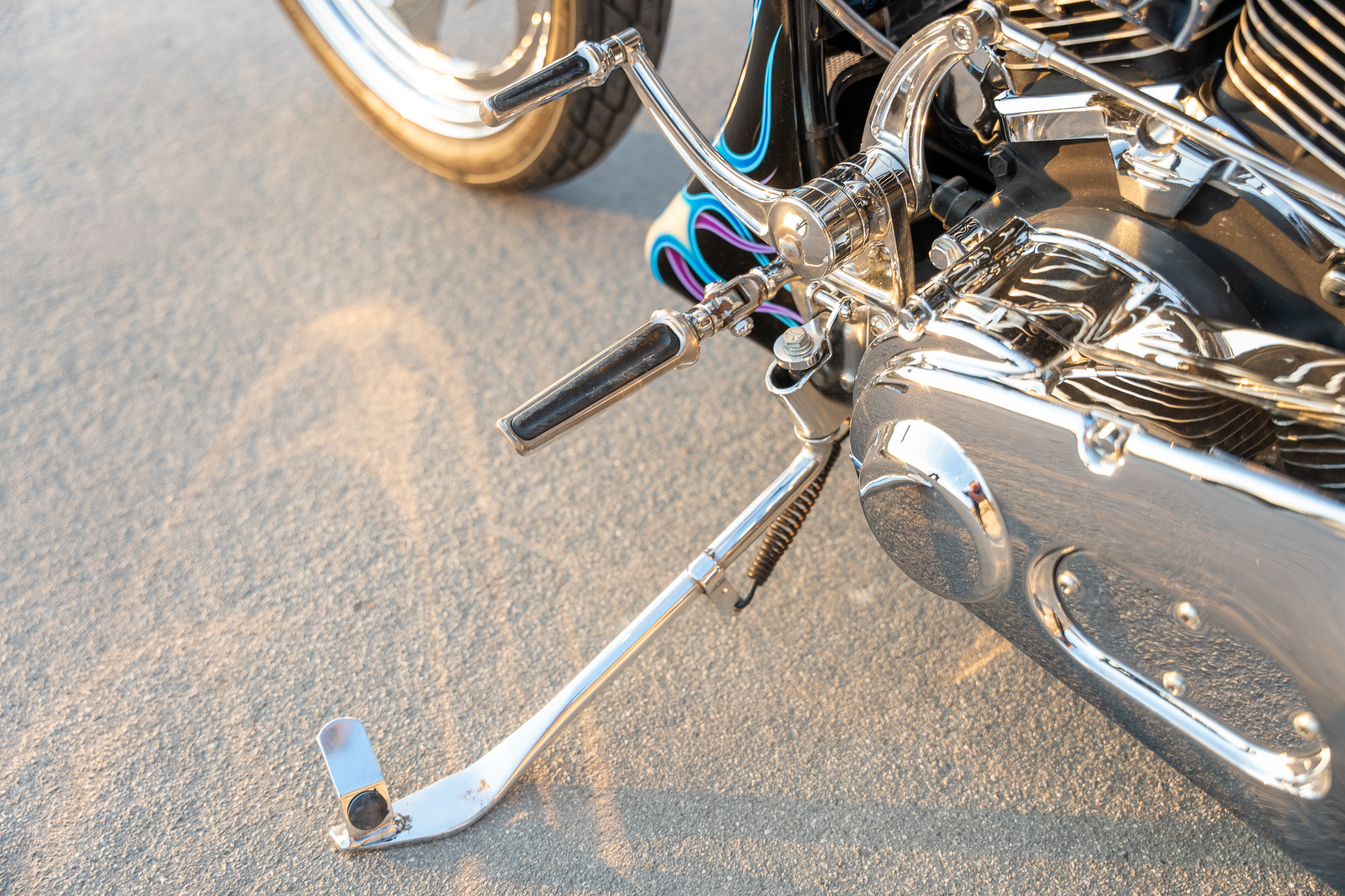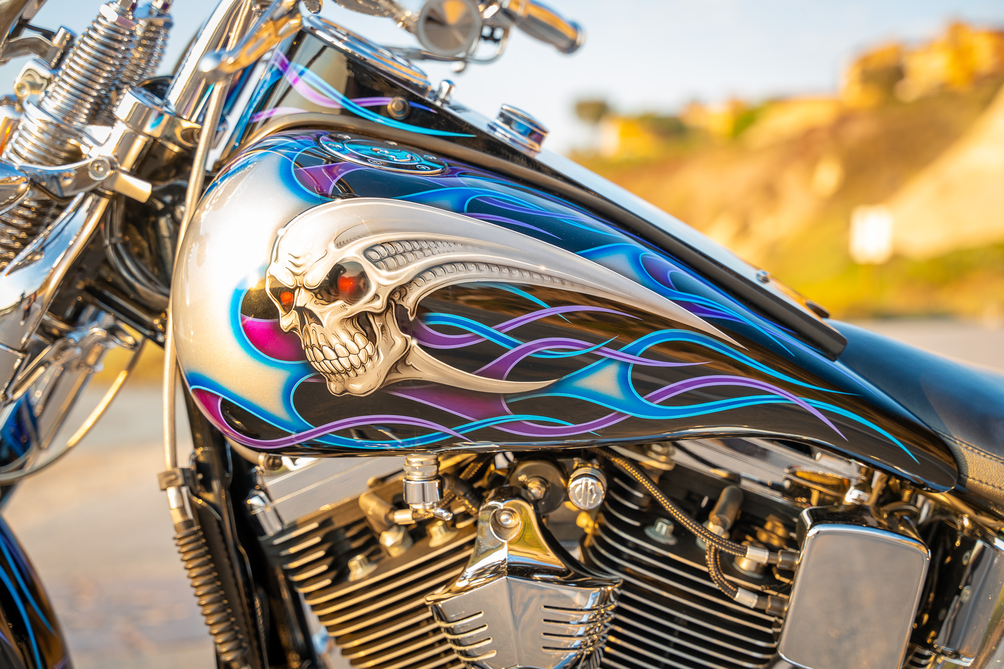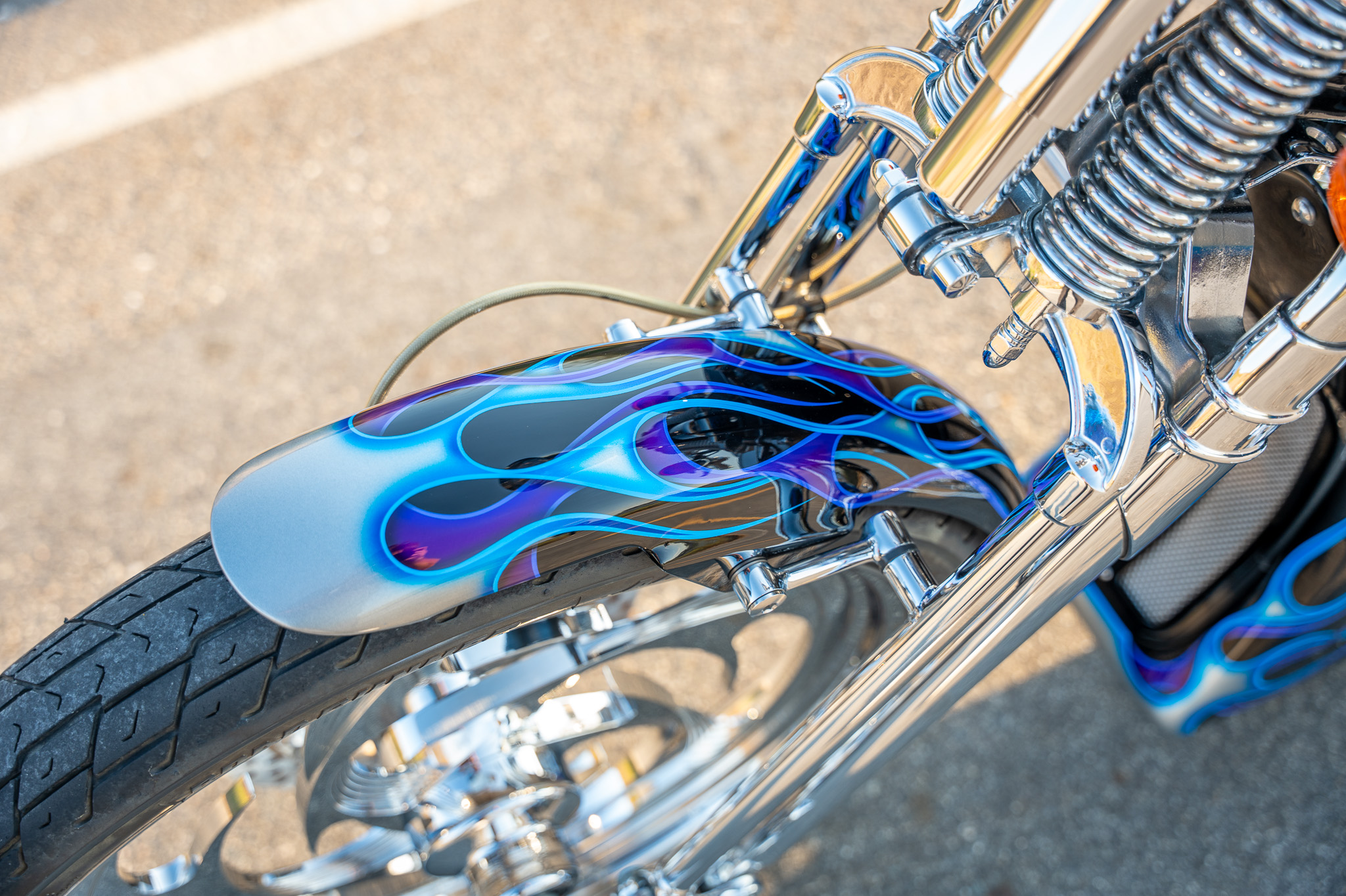 The Custom Skull to go with the Fading Purple and Blue Flames makes this chopper flow. The Springer Front End compliments the Arlen Ness Front Head Light. The Bike has a nice mixture of chrome and paint, not too much of one or another.