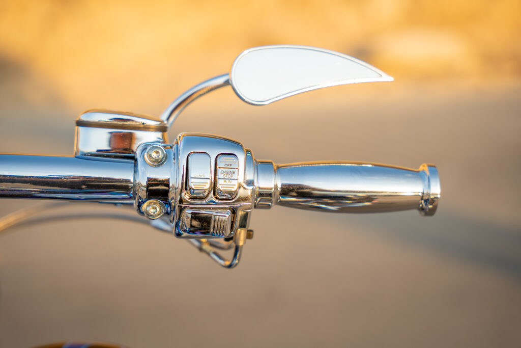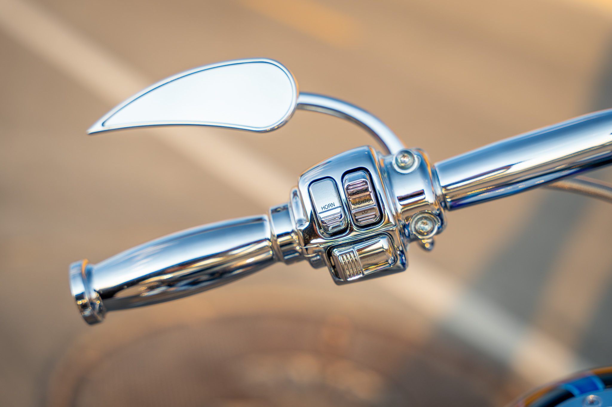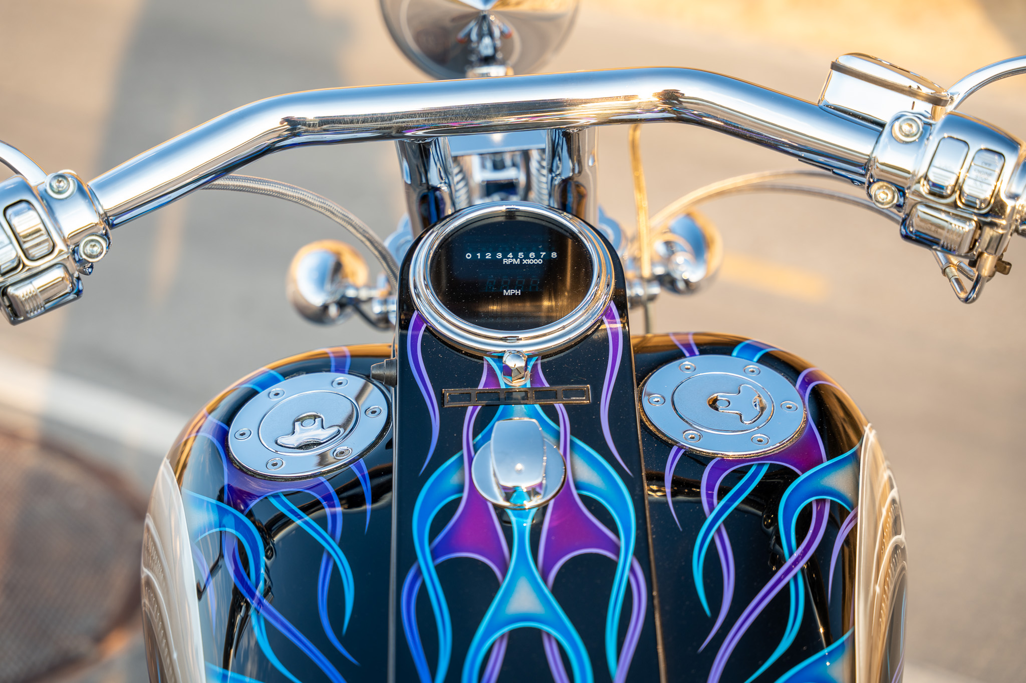 Twin Tanks with the Digital Gauge in the middle. The Purple and Blue Flames flow very well with the stretched Fuel Tanks. To the Right is a view of the Hand Controls including the Arlen Ness Mirrors.