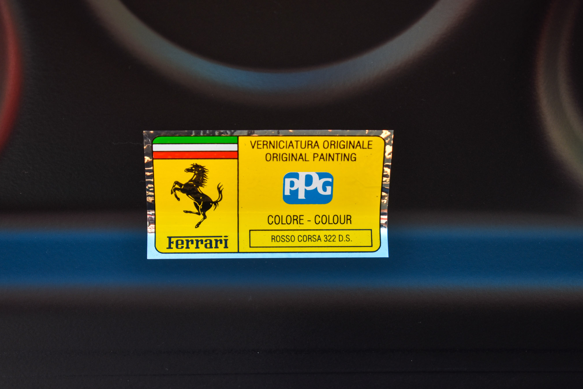 The silver accents compliment this well preserved Nero Leather cabin. It is detailed with a 3-spoke leather wheel, Daytona Style seats, Factory Radio, Crested headrests, power windows and mirrors, and the Sticky Buttons have been repaired. The Center console holds the Gated-shifter, Hood Release button, and the Manual Parking Break.